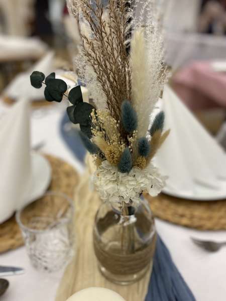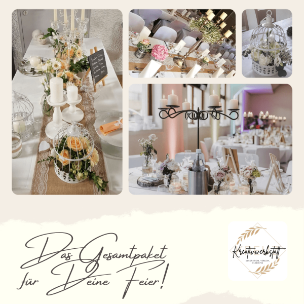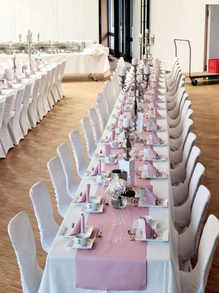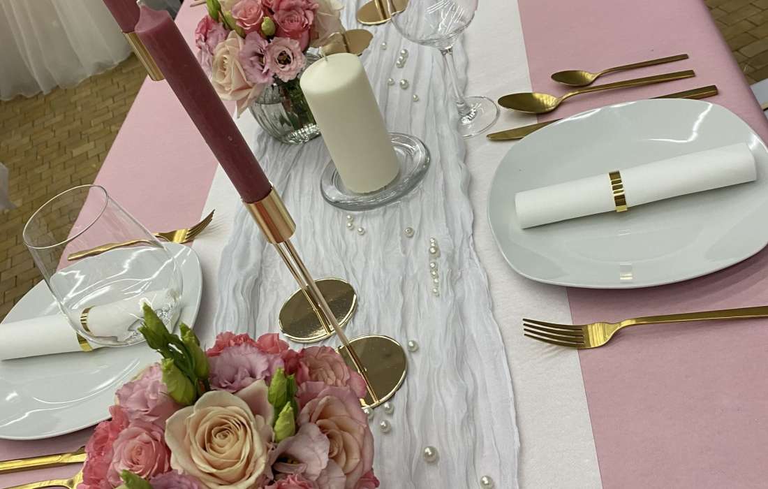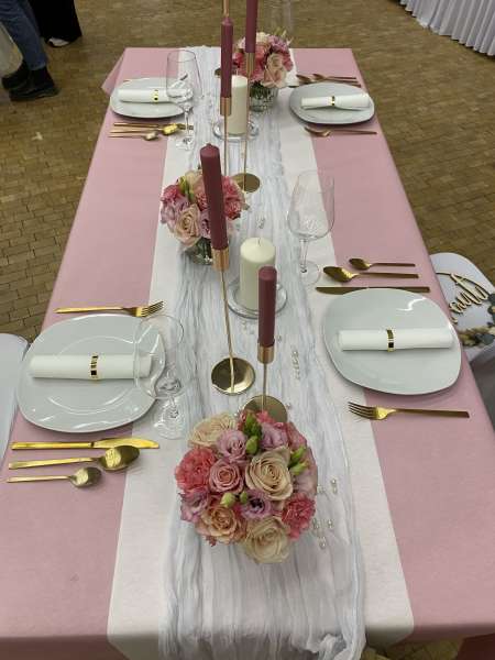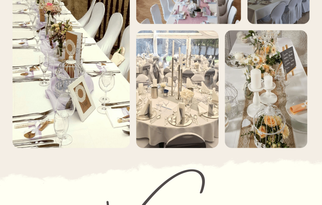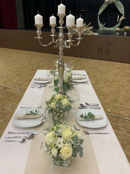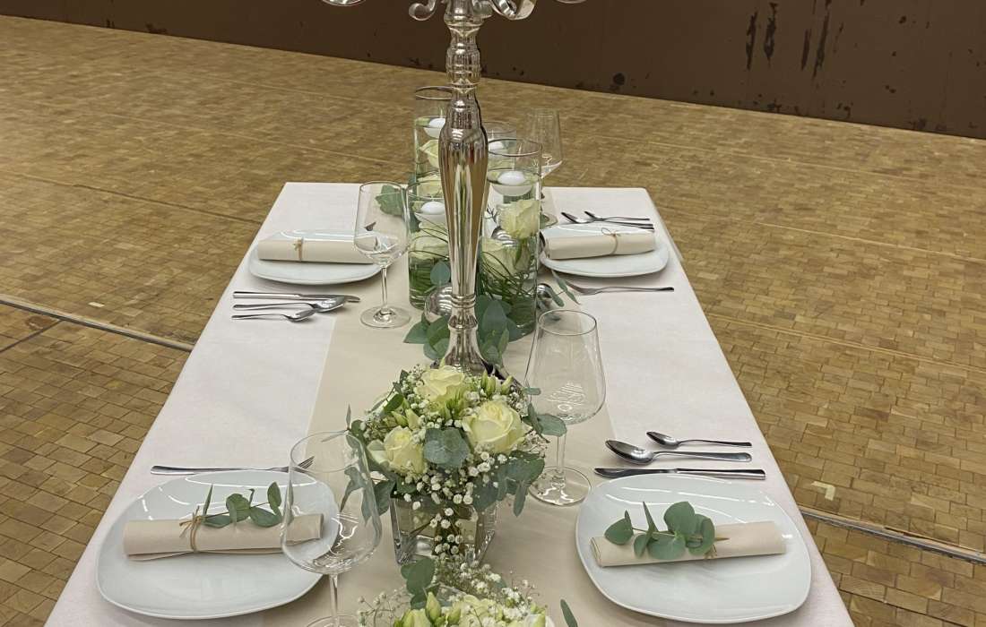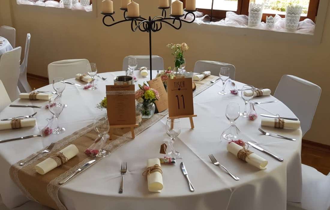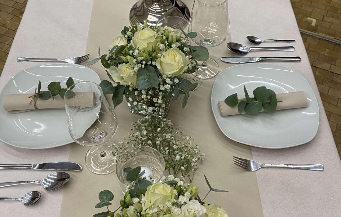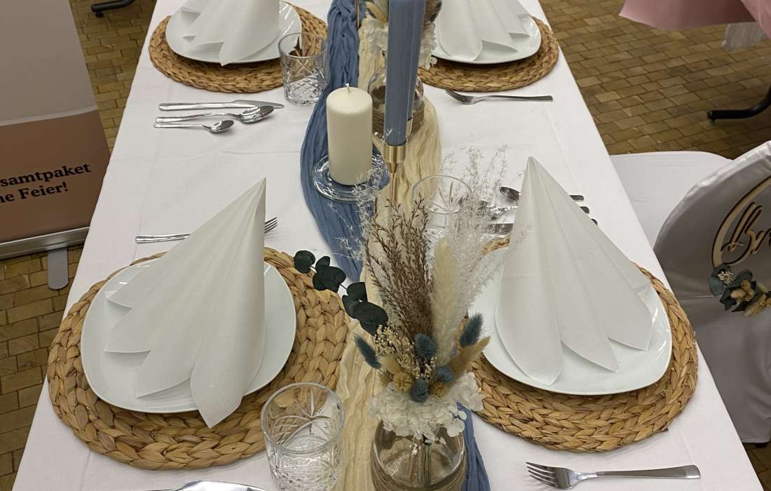 Von der Tischdecke, über die Blumen und die Kerzen, bis hin zu den Tischkarten und den Stuhlhussen, ich kümmere mich um alles. Selbst Tische, Besteck und Gläser können bei mir gemietet werden.