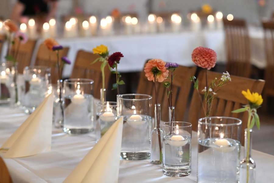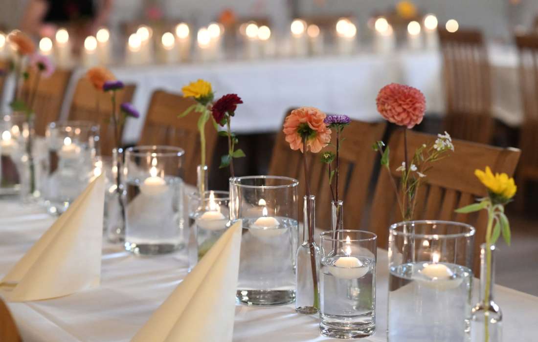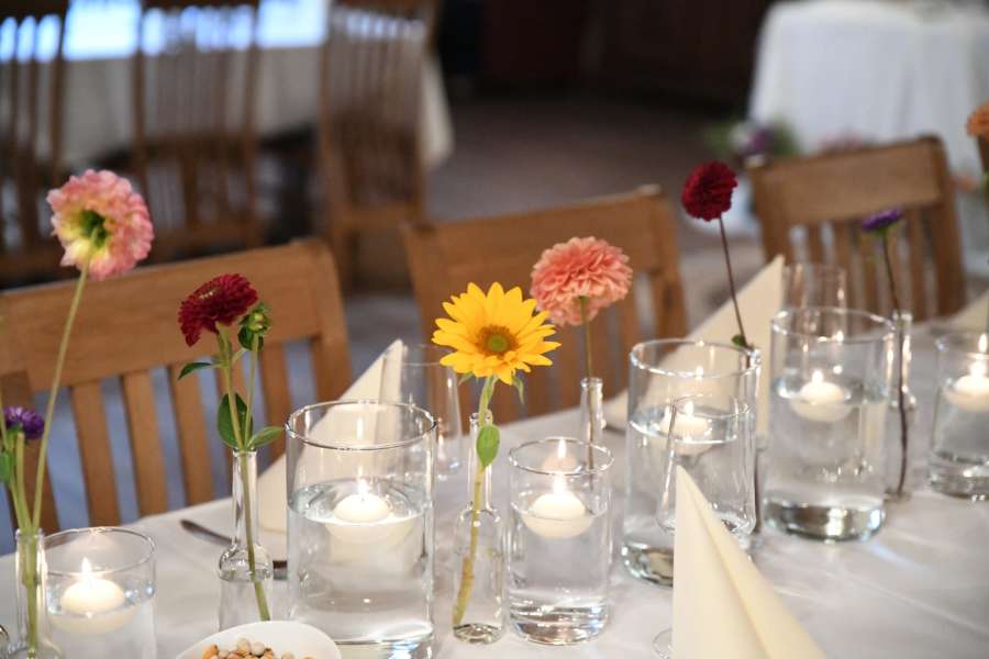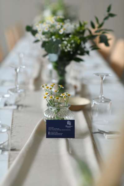 Eine wunderschöne Tischdekoration mit bezaubernder, frischer Floristik wird Eure Feier märchenhaft gestalten.