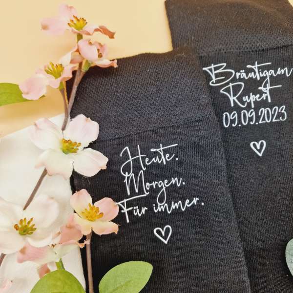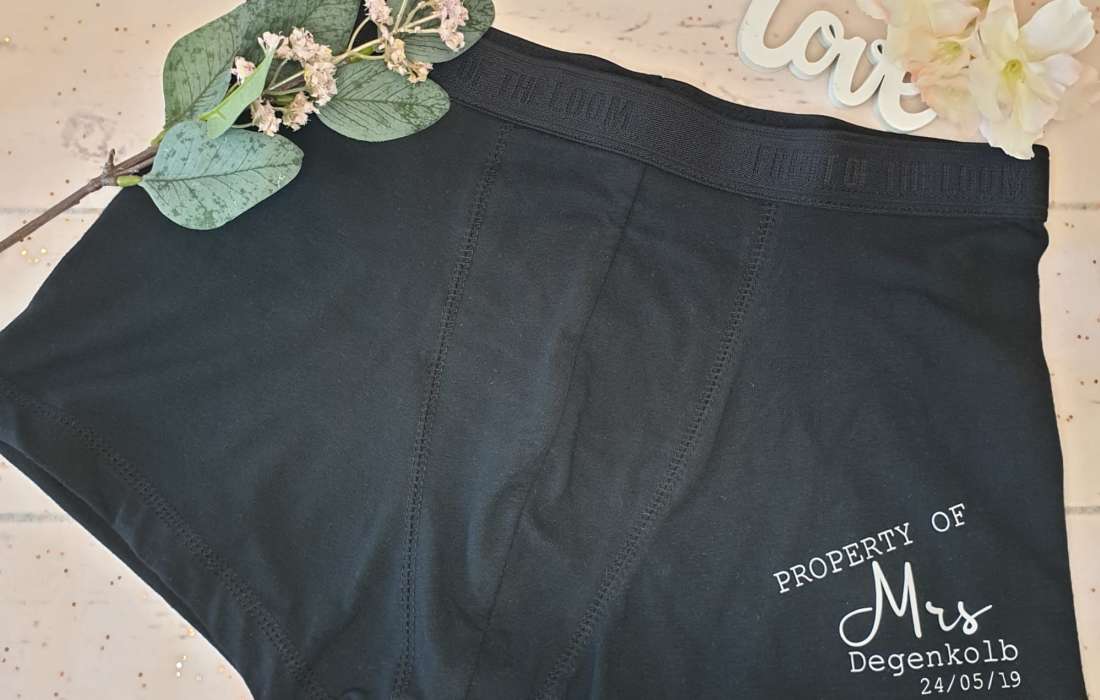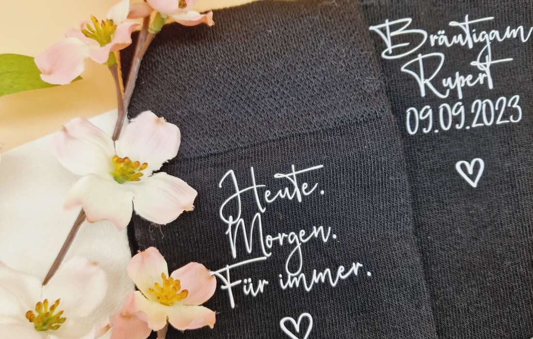 → Finde personalisierte Produkte für den Bräutigam wie Hochzeitssocken oder Boxershorts.