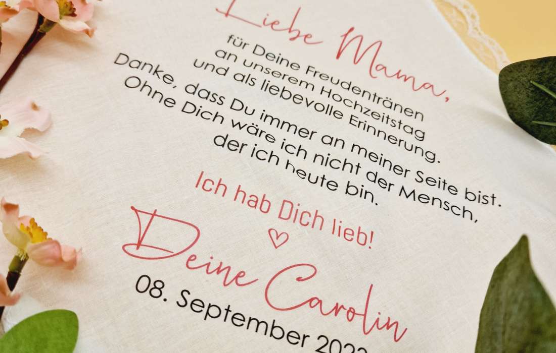 Ob es um liebevoll gestaltete Sektgläser für das "Getting Ready" geht, ein herzliches Dankeschön für deine Trauzeugin oder persönliche Worte für deine Mama – in jedes meiner Produkte fließt nicht nur eine extra Portion Liebe, sondern auch eine tiefe emotionale Verbindung ein.