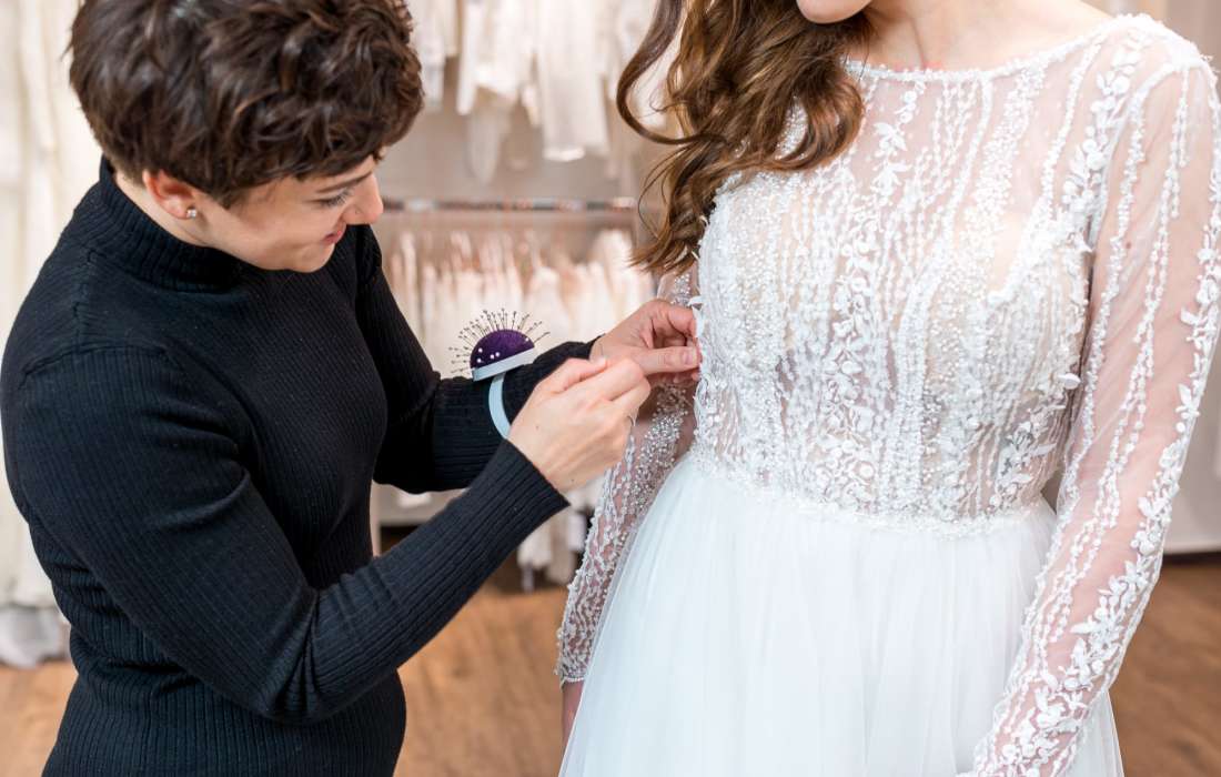 Für die passgenaue Änderung des Brautkleides bieten sowohl unsere hauseigene Schneiderei, als auch unsere Partnerschneidereien einen Rundum-Service.