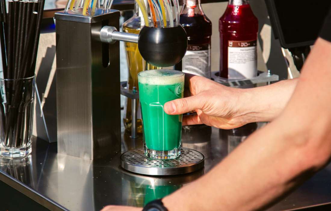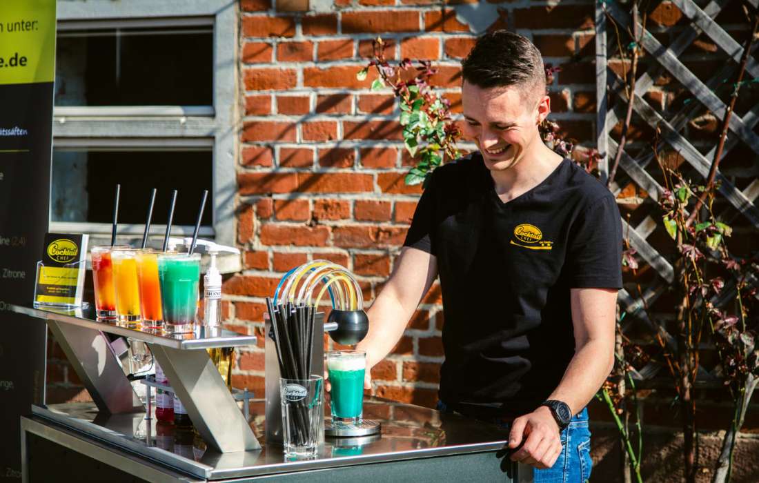 Mit dieser Cocktailanlage können Sie oder einer Ihrer fleißigen Helfer nach einer kurzen Einweisung von uns selbständig Cocktails für Ihre Gäste mixen.