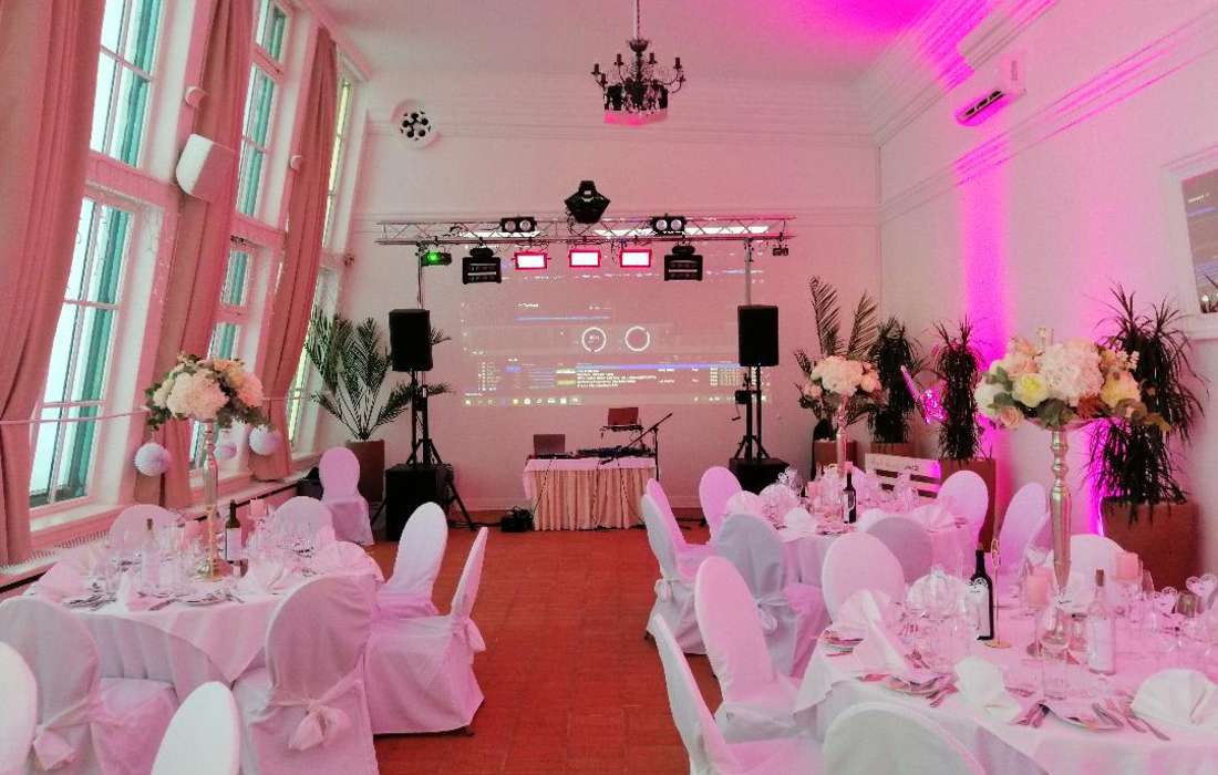 Eine eigene PA-Anlage für die Beschallung von bis zu 500 Personen (je nach gewünschter Lautstärke) mit bis zu drei Funkmikrofonen steht zu Ihrer Verfügung. Auch eine eigene Lichtanlage ist vorhanden, die für die effektvolle Beleuchtung Ihres Veranstaltungsraumes eingesetzt werden kann