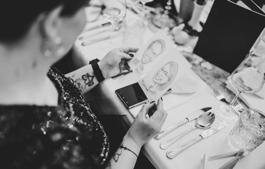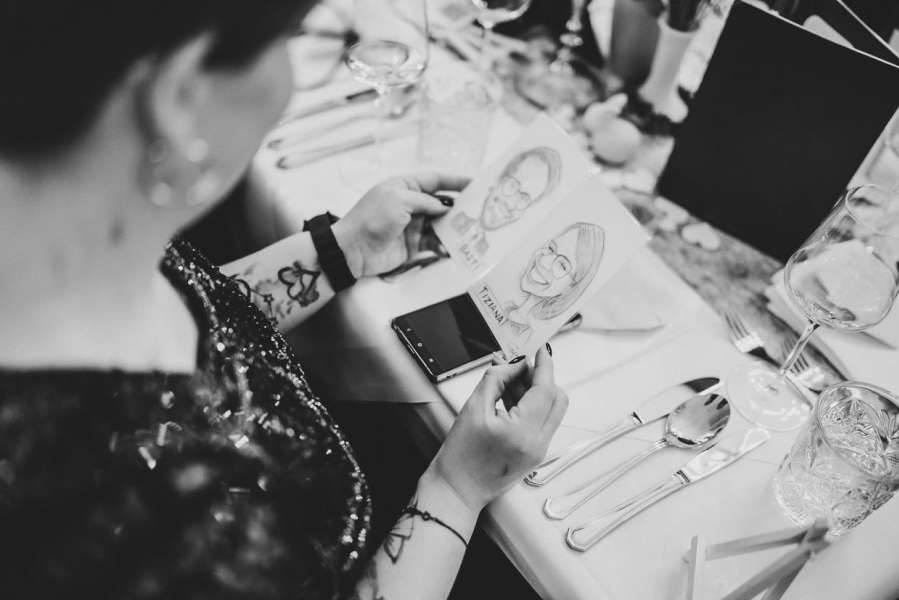 Die Karten zeichne ich von Hand, nicht mit digitaler Technik, und anhand dieser finden die Gäste ihre Plätze. Daher zeichne ich die Gäste niemals beleidigend, sondern eher wie Comicfiguren.