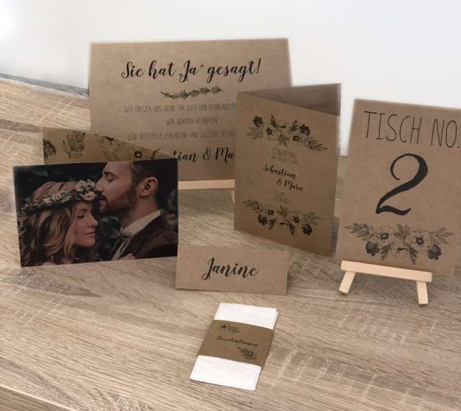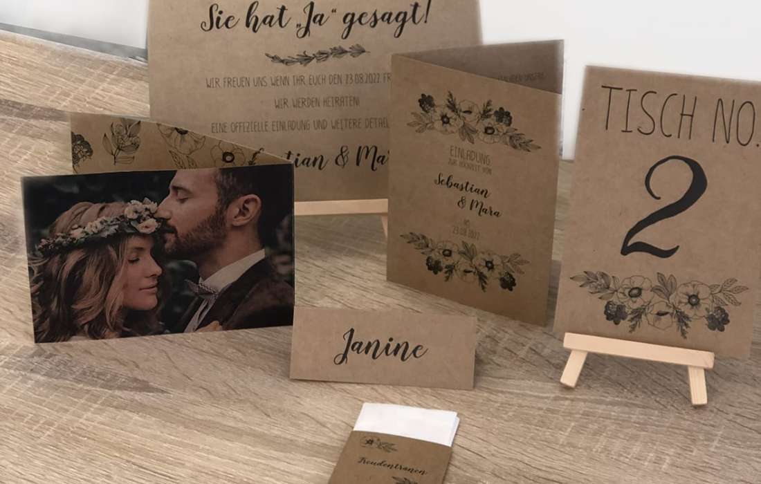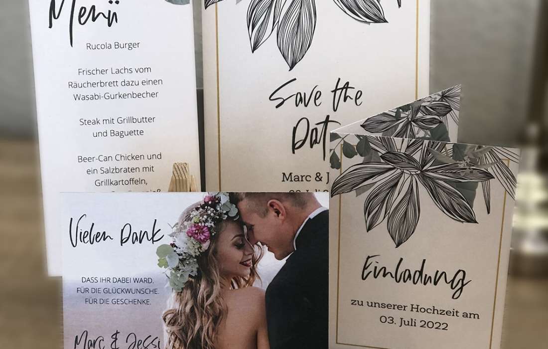 Unsere Grafiker sind Spezialisten und können Eure Wünsche direkt umsetzen. Die Designs der Karten sind so individuell und einmalig wie Eure Hochzeit. Somit unterscheiden die Karten sich stark von der Massenware, sind aber nicht teurer.