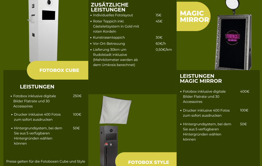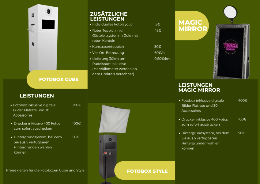 | Art der Fotobox | Fotobox, Fotospiegel |