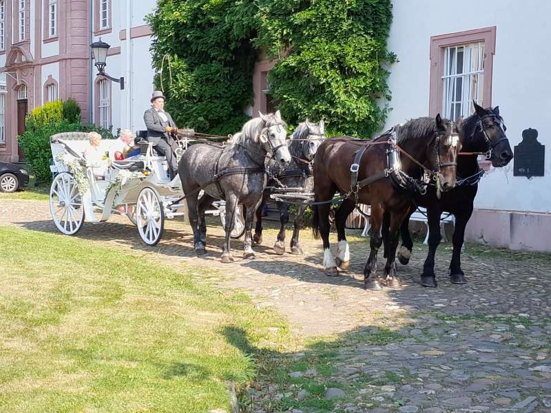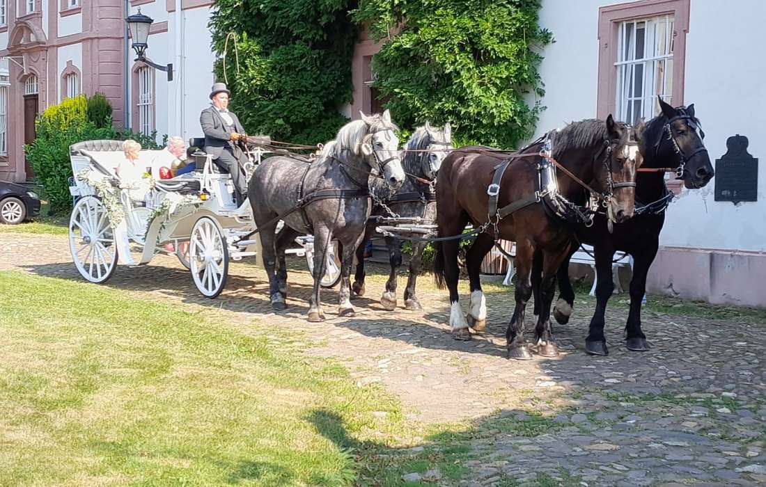 Wir holen Euch vor dem Standesamt, von der Kirche oder einem anderen beliebigen Ort mit unserer wunderschönen Hochzeitskutsche ab. Anschließend könnt Ihr eure Vermählung bei einer Kutschfahrt genießen.