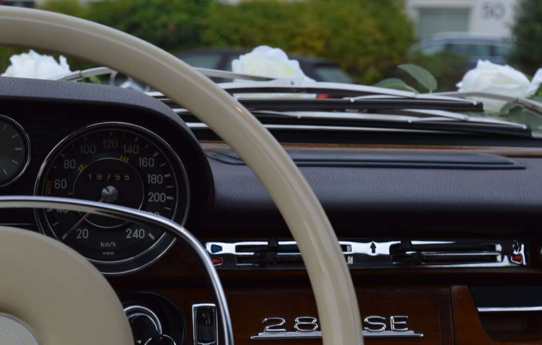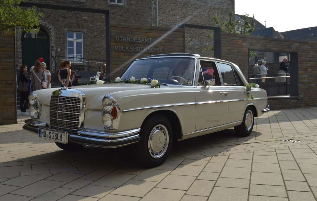 Wir bieten u.a. einen frisch restaurierten Mercedes Benz 280 SE W108, Bj 1969, für Hochzeitsfahrten mit Chauffeur an.