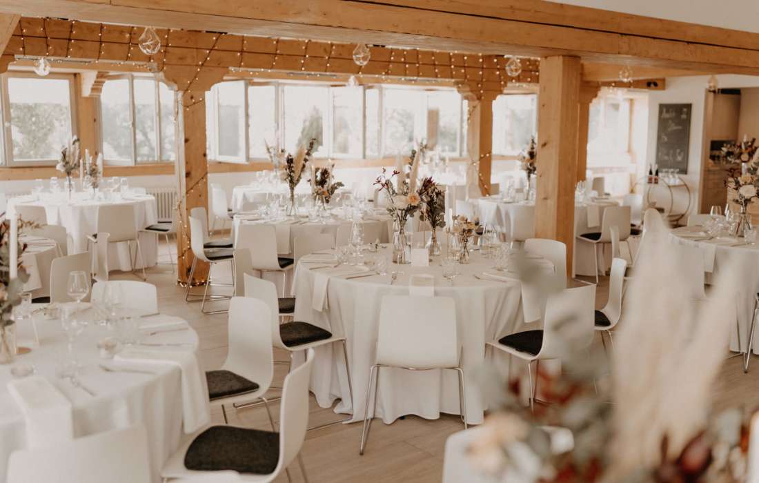| Erklärung zur Gästezahl | Mit unseren runden Tischen finden sich hier Platz für rund 100 Gäste inklusive Tanzfläche. Bei unseren eckigen Tafeln können sogar bis zu 150 Gäste beim wichtigsten Tag eures Lebens mit dabei sein |