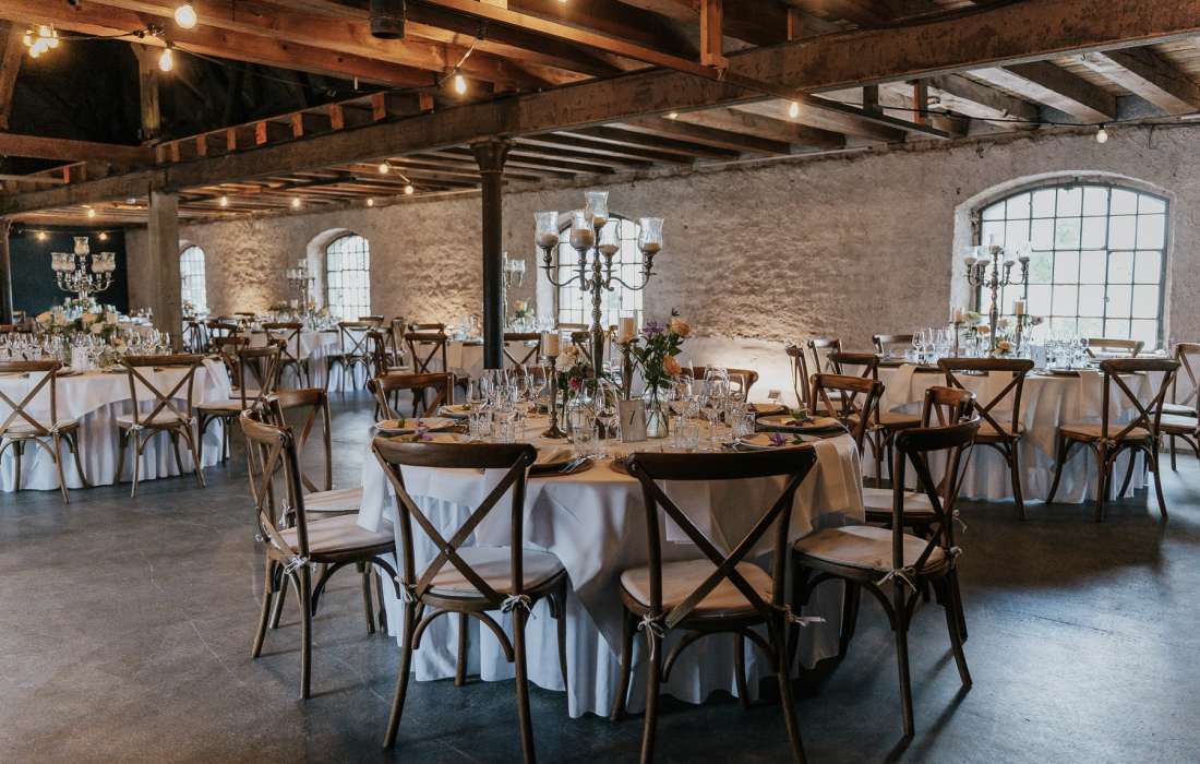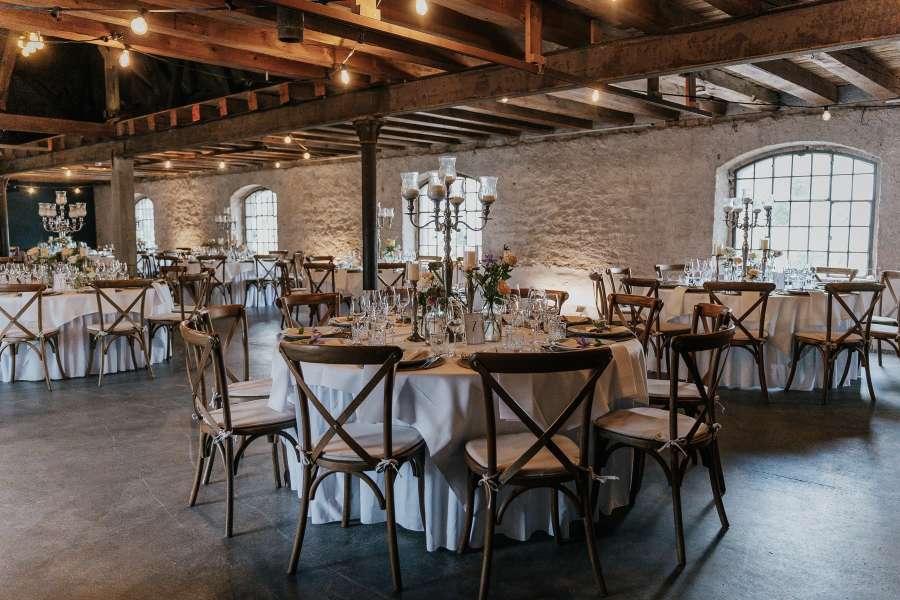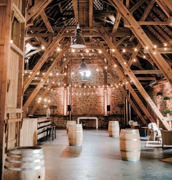 Ein ganz besonderes Highlight ist der angrenzende ehemalige Heuboden. Mit seinem beeindruckenden zwölf Meter hohen Dachstuhl und dem kunstvollen Gebälk bietet er die perfekte Kulisse für eine unvergessliche Feier am Abend. Die harmonische Verbindung von Holz und Sandsteingemäuer verleiht dem Raum eine einzigartige Wärme, während die stilvolle Inneneinrichtung mit modernen Eichentischen, Weinfässern und Champagnerrüttlern das Ambiente perfekt abrundet. Hier finden auch die Gäste, die nicht das Tanzbein schwingen, einen gemütlichen Platz zum Verweilen und Genießen.