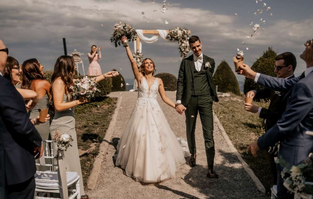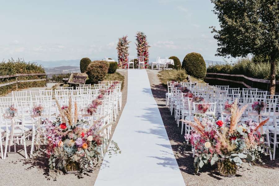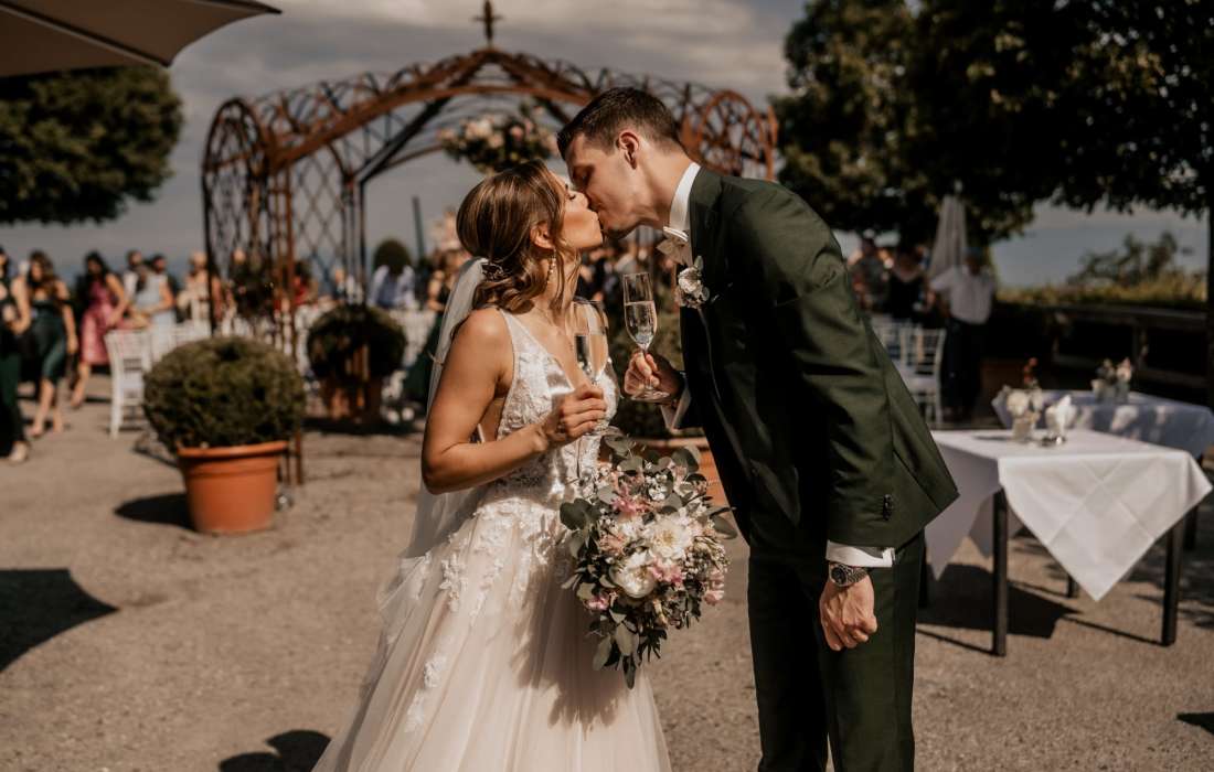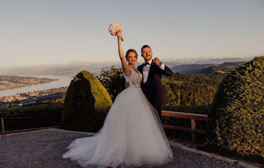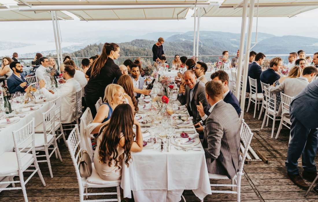 Der Rahmen könnte nicht besser sein: Ein atemberaubender Ausblick auf die Stadt, den See und die Alpen – umgeben von Bäumen und Bergluft. Schmücken Sie Ihre Hochzeit mit bezaubernder Atmosphäre und machen Sie den autofreien Uetliberg zu Ihrer Hochzeitslocation.