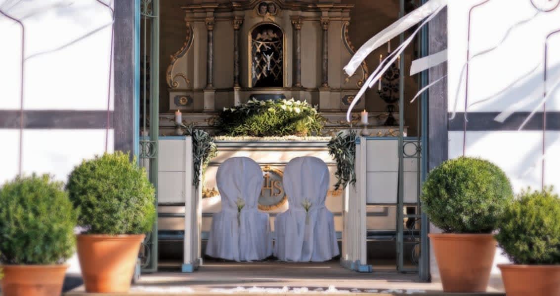 Unsere romantische St. Antonius-Kapelle, das Trauzimmer „Kaiser Barbarossa“ oder unsere wunderschönen Parkanlagen bieten Ihnen alle Möglichkeiten für eine kirchliche, standesamtliche oder freie Trauung.