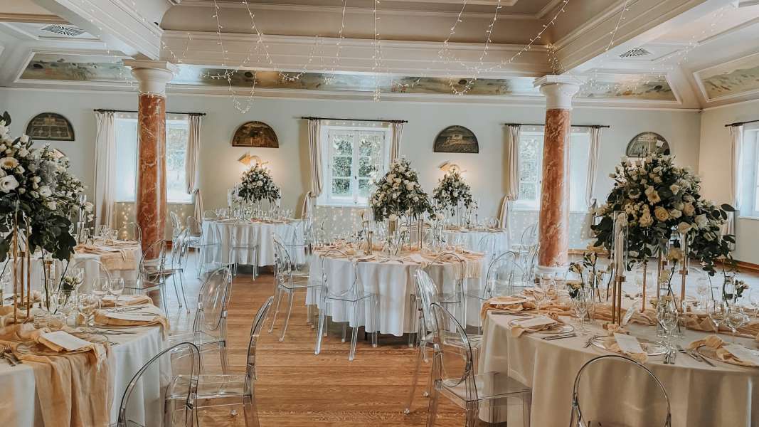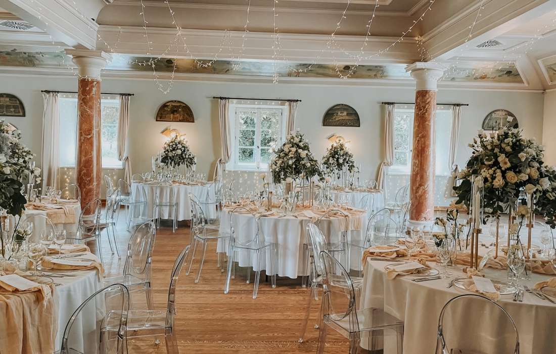 Nach der Zeremonie bitten Sie Ihre Gäste zum Champagnerempfang in den Rosengarten oder auf die Terrasse unseres Marstalls. Festsäle mit Tanzfläche lassen Raum für traumhafte Feiern.