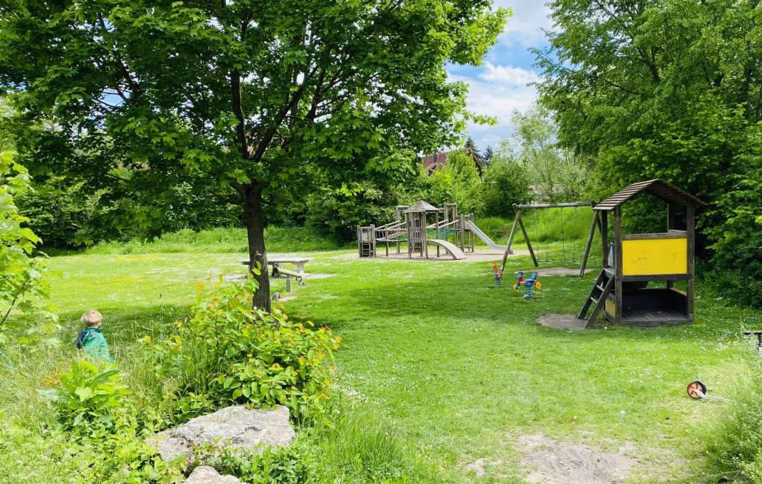 Der Spielplatz befindet sich in Sichtweite, direkt gegenüber der Strasse.