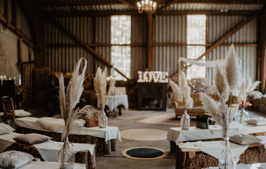 In unsere schöne Trauscheune mit Strohballen-Sitzbänken, Felle, Decken und Kissen könnt ihr euch frei trauen lassen. Ihr feiert an Eurem gebuchten Termin exklusiv bei uns und bleibt unter euch.