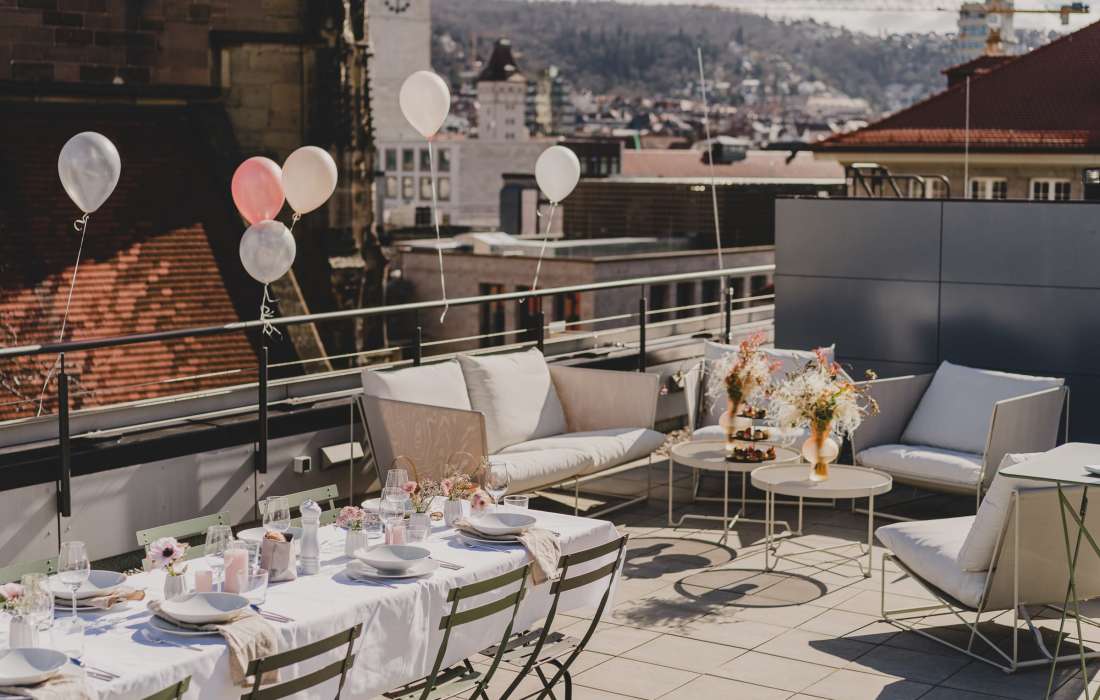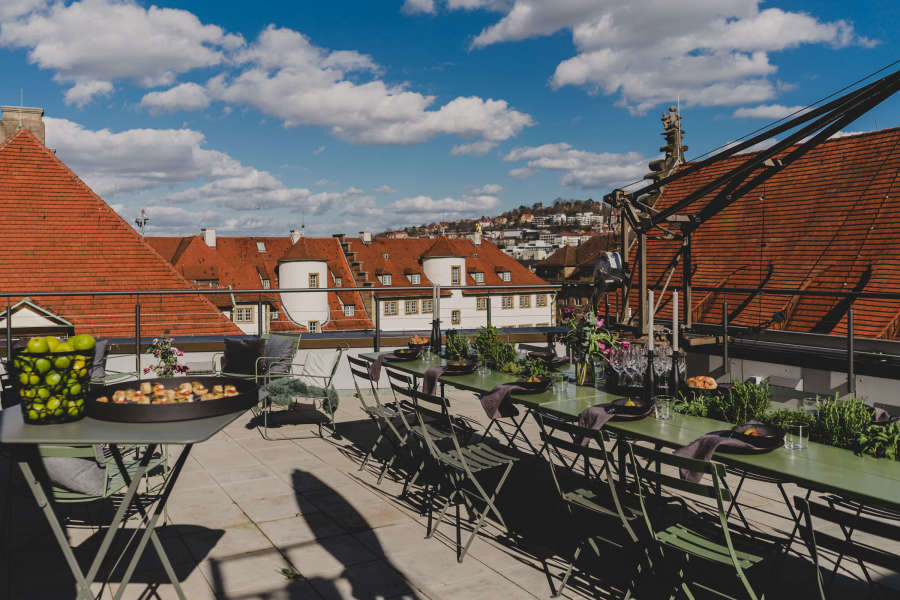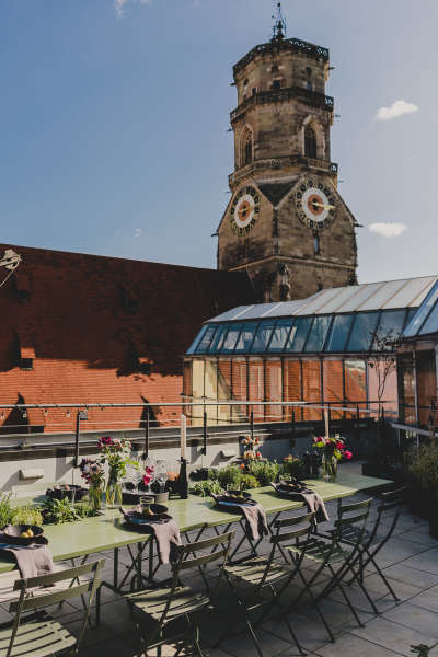 Unsere Location befindet sich direkt neben der Stiftskirche im 4.OG. Über eine Treppe innerhalb des Lofts erklimmt man die große Dachterrasse inklusive Wintergarten mit einem wunderbaren Blick über Stuttgart. Ideal für Parties, BBQ und Brunches über den Dächern Deiner Stadt.