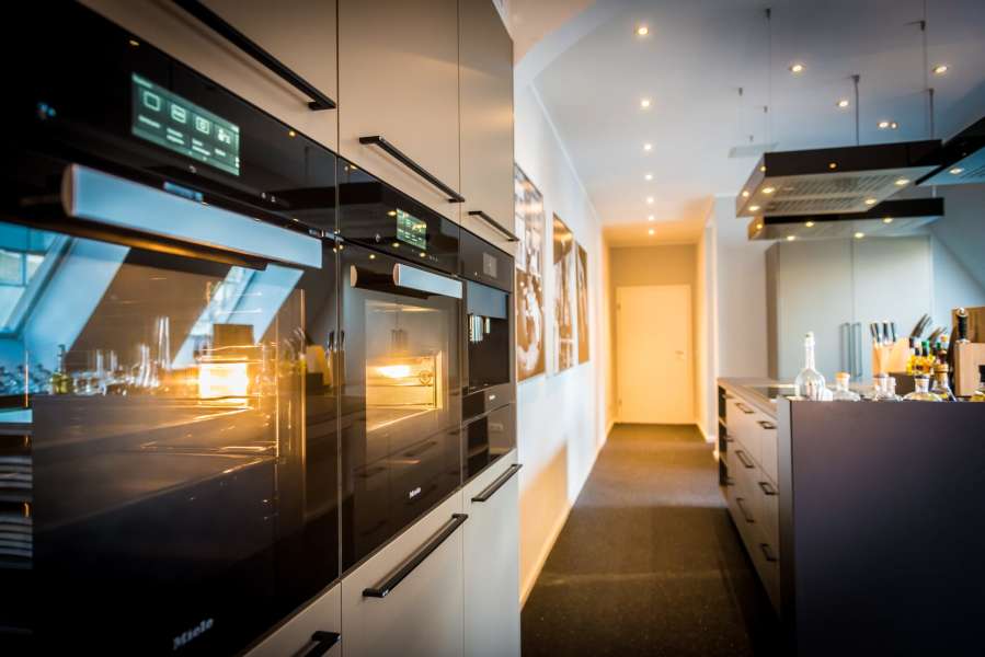 Das auf der 4. Etage gelegene Penthouse Rheinloft Cologne, das angrenzende kleine Loft, zwei hochprofessionell ausgestattete Kochateliers und der Dachgarten bieten ein majestätisches Ambiente!