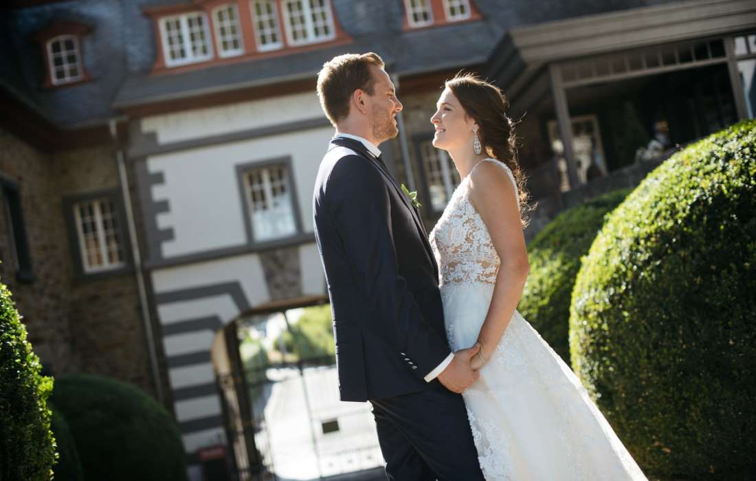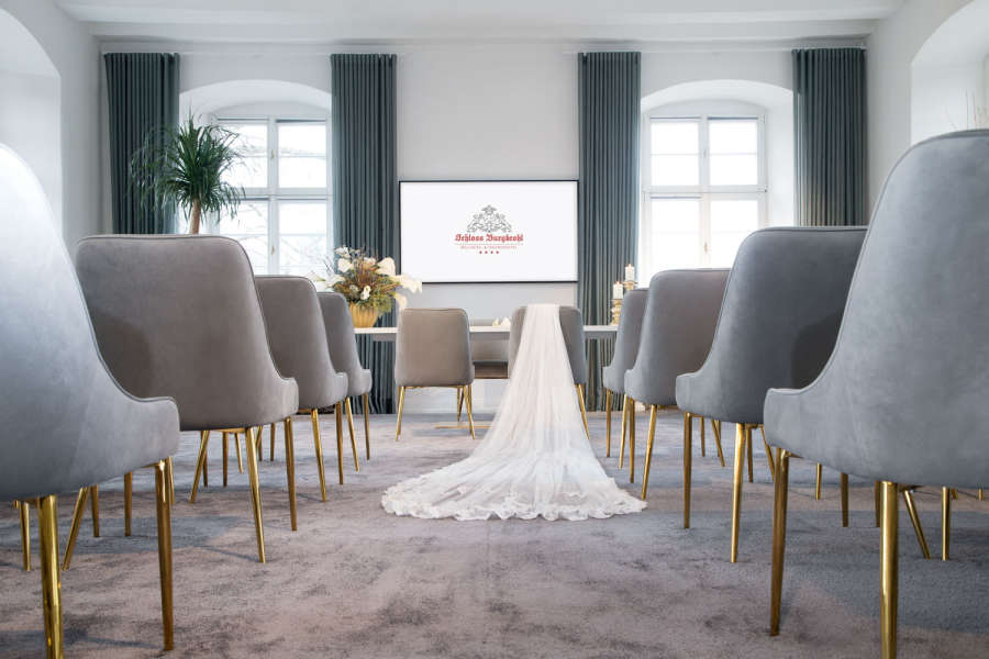 Lichtdurchflutet zaubert das helle Interieur in unserer Schloss Villa für bis zu 70 Gäste eine festliche und ruhige Atmosphäre. Ihre Eheschließung findet auf Schloss Burgbrohl an einem einzigartigen und dennoch offiziellen Trauort des örtlichen Standesamtes statt. Hier haben Sie die Möglichkeit, den Bund fürs Leben sowohl in einer standesamtlichen als auch freien Trauzeremonie