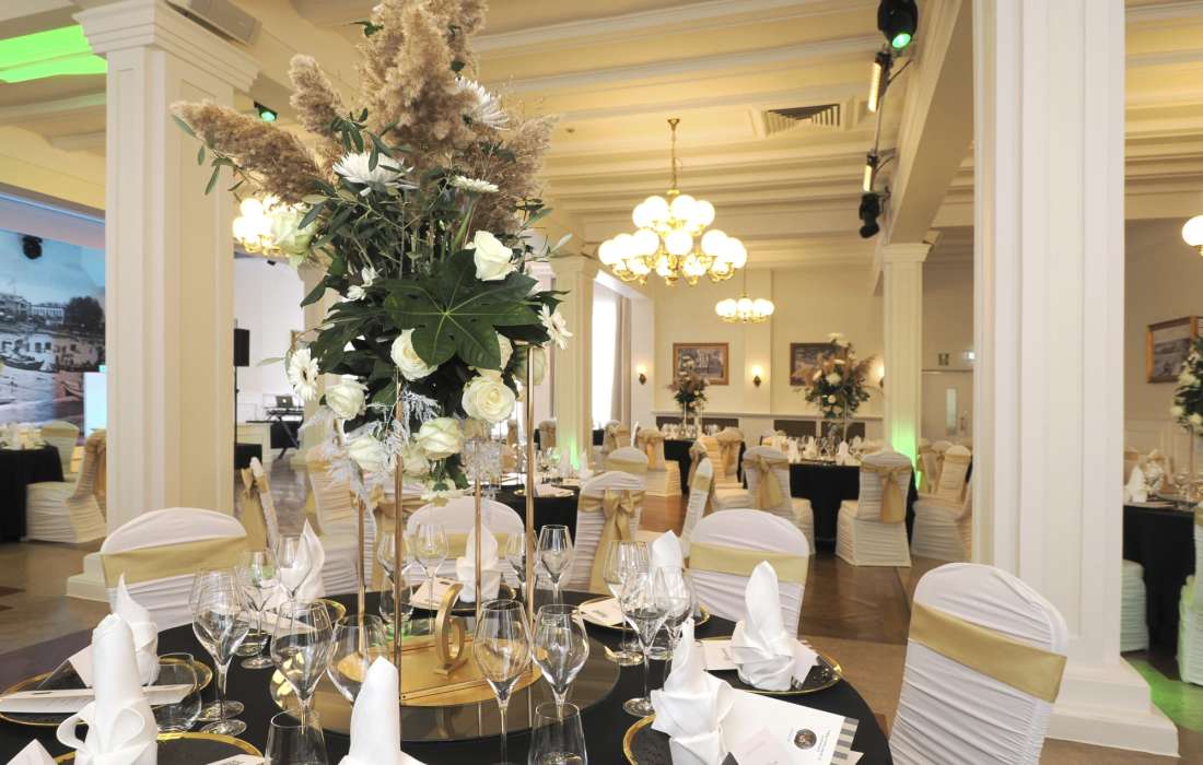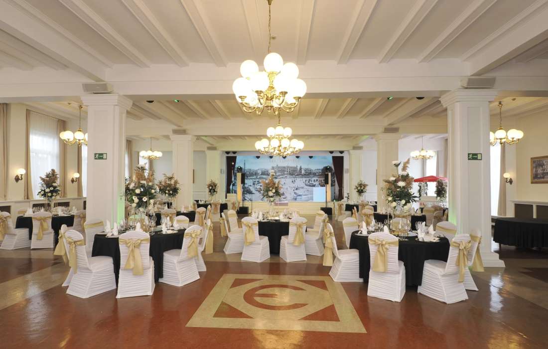 Auf mehr als 250 qm für max. 200 Personen lassen sich im historischen Festsaal rauschende Feste feiern und erstklassige Veranstaltungen durchführen. Der Festsaal mit integrierter Bar, Theaterbühne und Tanzfläche ist der perfekte Ort für große Empfänge, Familien- und Firmenfeiern sowie Hochzeiten.