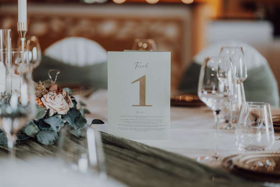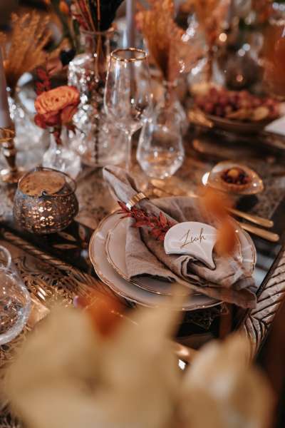 Fertig eingedeckt mit goldenen Tellern, Tischdecken, Besteck und Gläsern.