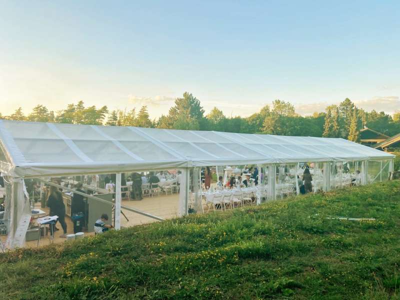Unser transparentes Zelt liegt absolut im Trend und bietet eine hohe Planungssicherheit. Es schützt ebenso gut vor Wind und Regen, wie ein herkömmliches Festzelt. Zusätzlich gibt es den Blick frei in die wunderschöne Natur unseres Areals und durch das transparente Dach natürlich auch in den Himmel, was automatisch für eine schöne Atmosphäre im Eventzelt sorgt.