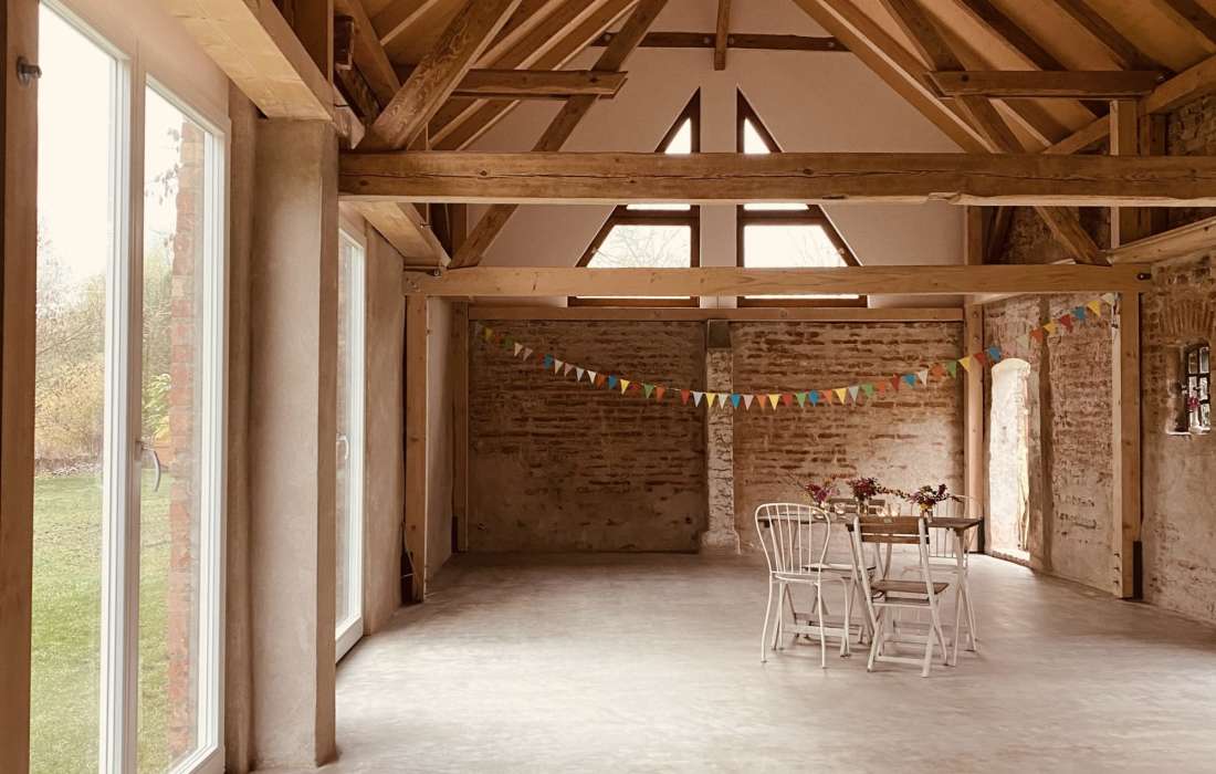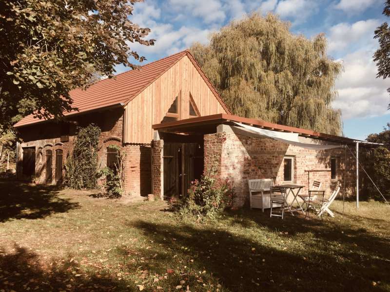 Die Villa Boskow ist eine alte Backsteinscheune mit neuen großen Fenstern, inmitten eines idyllischen, großen Gartens mit alten Bäumen und Platz für kleine und große Träume.
