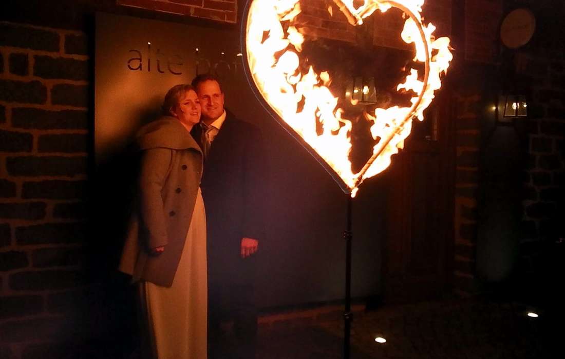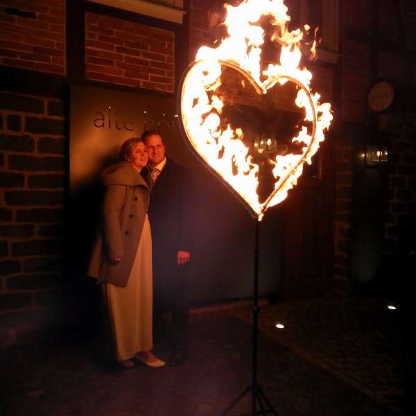 Unsere exklusiven Hochzeits-Shows enthalten eine energiegeladene Darbietung mit kraftvoller Musik, technischer Jonglage, etwas Comedy, große Flammen und ein noch größeres Funkenfinale, das so jedes Feuerwerk neidisch werden lässt (anmeldungsfrei!). Das Programm dauert ca. 20 Minuten und kann durch besondere Extras wie brennende Strukturen und/oder eine LED High-Tech Einlage als Zugabe ergänzt werden. Erinnerungsfotos mit einem brennenden Herz sind immer ein außergewöhnlicher Moment für das Brautpaar.